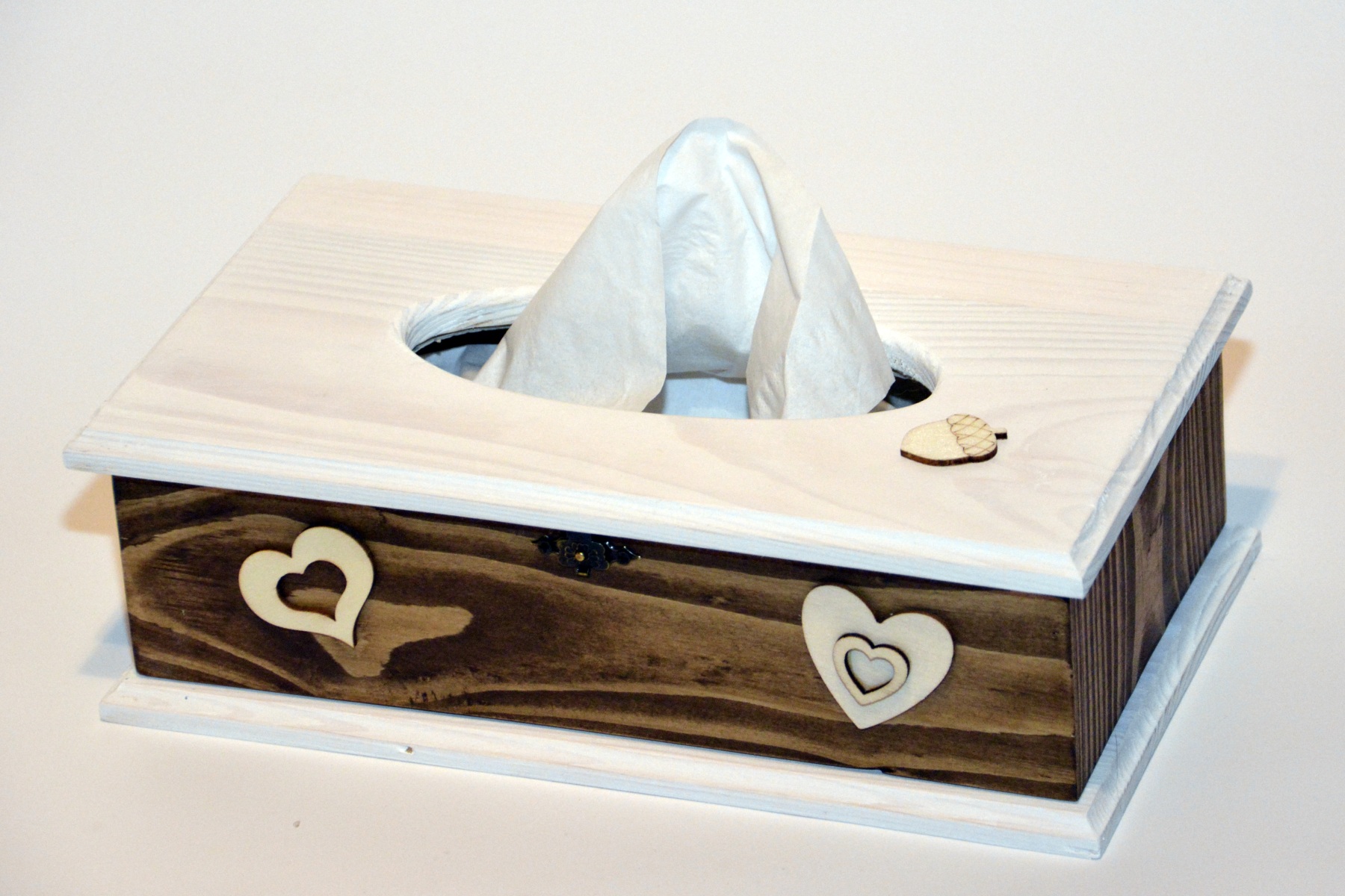 Krabičky jsou vyrobeny z různých dřev. Ozdoby jsou buď vypalované laserem nebo vyrobeny z plodu ořešáku a nalepeny. Horní víko lze odklopit, vložit papírovou krabičku s kapesníky a zajistit západkou.
