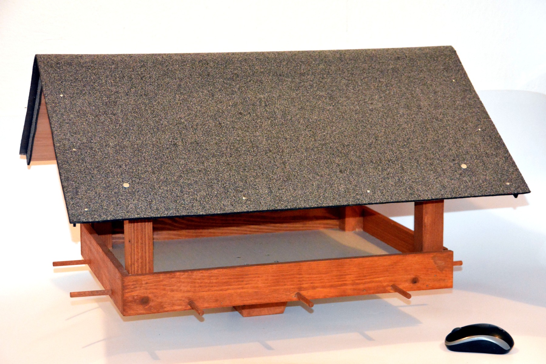 Krmítko má na jedné delší straně dvě očka pro uchycení. Na druhé straně pak dva přistávací kolíky pro ptáky. Střecha je z lepenky sypané kamennou drtí. Dno a střecha je z lamina nebo dřevotřísky. Konstrukce je dřevěná, lepená, spoje hřebíky a šrouby. Všechny dřevěné část jsou z recyklovaného materiálu.