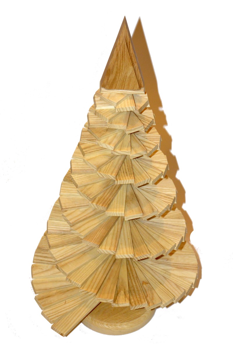 Dřevěný vánoční stromek o celkové výšce XX a maximálním průměru XX cm. Vyroben kompletně ze dřeva jasanu. . Další varianty jsou buk a směs dřev buku a smrku.
