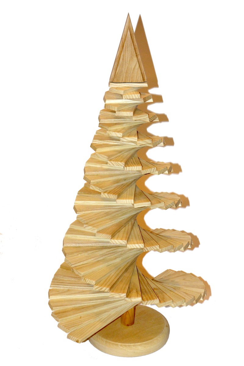 Dřevěný vánoční stromek o celkové výšce XX a maximálním průměru XX cm. Vyroben kompletně ze dřeva jasanu. . Další varianty jsou buk a směs dřev buku a smrku.