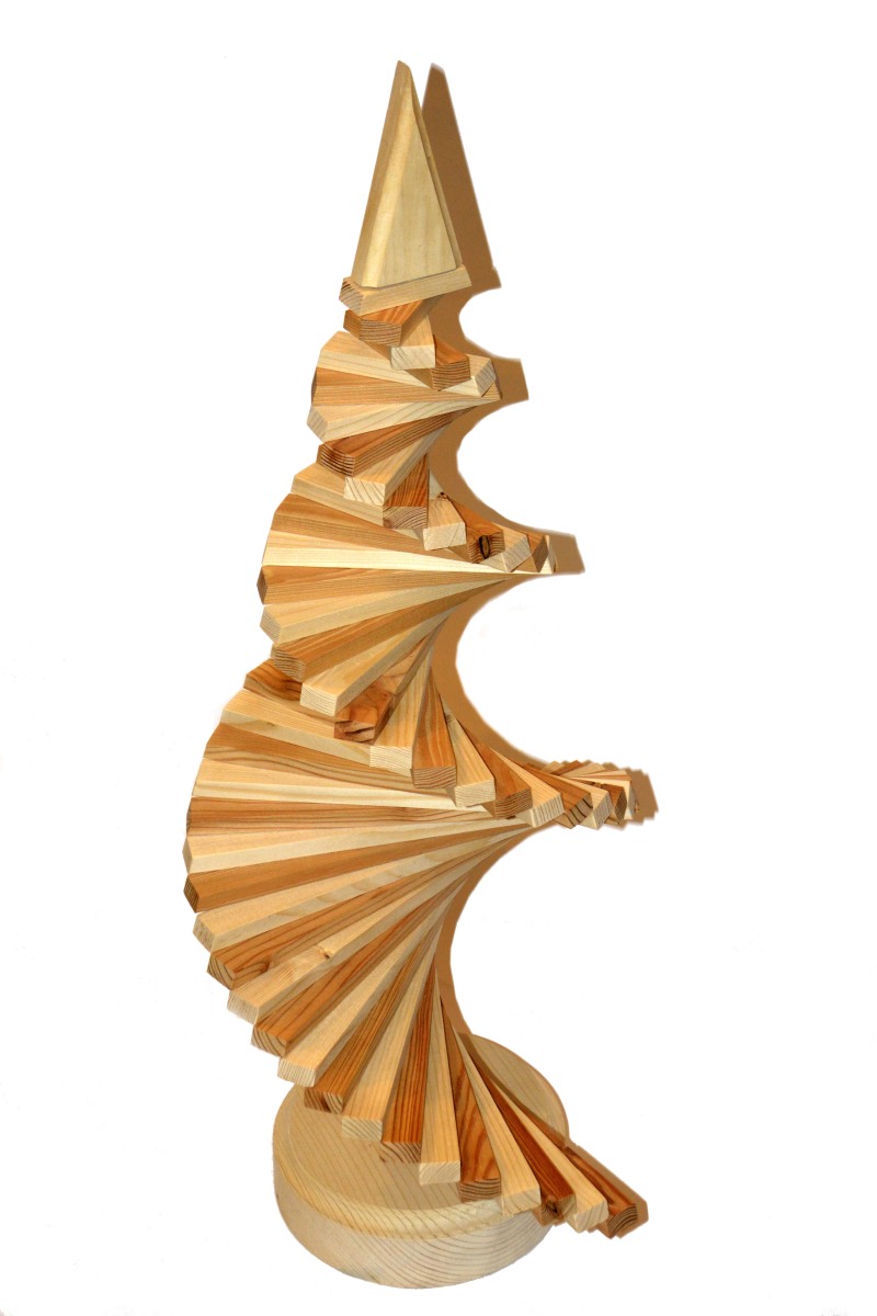 Dřevěný vánoční stromek o celkové výšce XX a maximálním průměru XX cm. Vyroben ze dřev smrku a modřínu, laťky jsou pravidelně střídány, aby se dosáhlo dvojbarevného efektu. Podstavec je ze smrkového masivu.